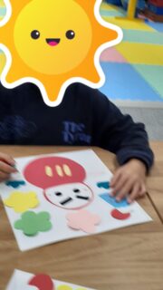 目やまゆげ、お花のパーツを台紙に貼ってオリジナルのだるまを作りました👍✨