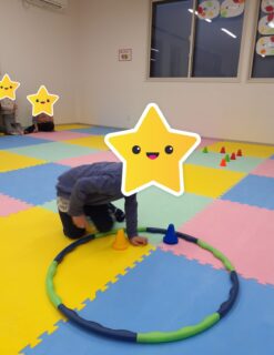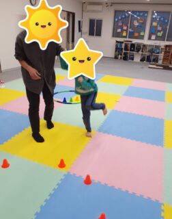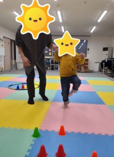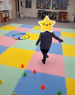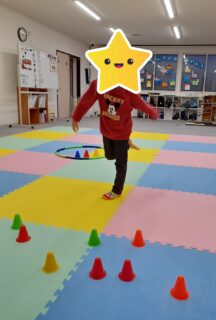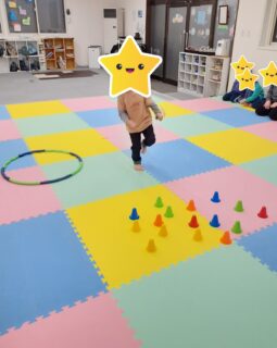 ケンケンで進みカラーコーンを取ってからフープの中まで持ってくる活動になります✨