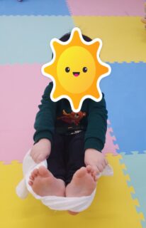 床にお尻をつけて足にタオルをかけてバランス✨✨