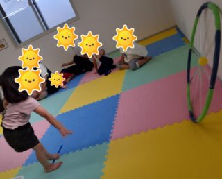 テープを貼ったフラフープにボールを投げてつける活動です!