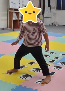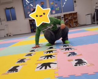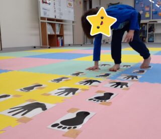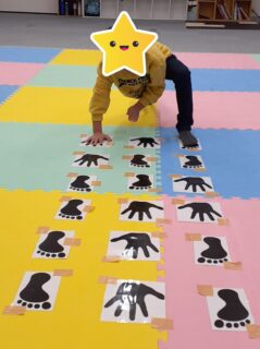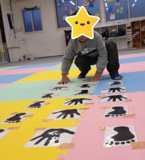手と足の型を床に貼ってその上を型に合わせて手と足を置きながら進みます👏