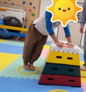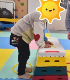 そして次に床にフープを4つ置き、跳び箱に手を置きながらフープからフープへ歩いて移動!!