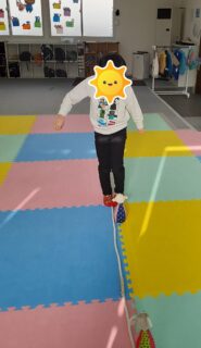 長縄に置いた障害物に見立てたミニコーン等を足があたらないようによけて歩く活動です!