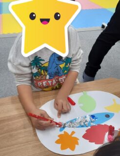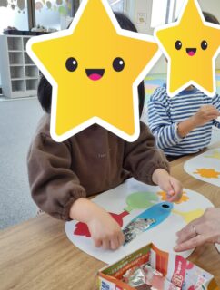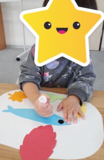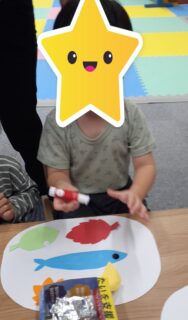 まずは、シールで👀目をペタリ。そして色とりどりの紅葉を貼りました🍁