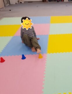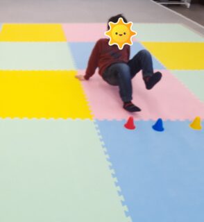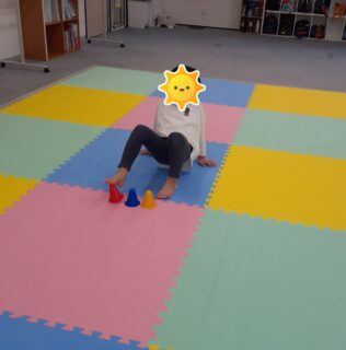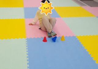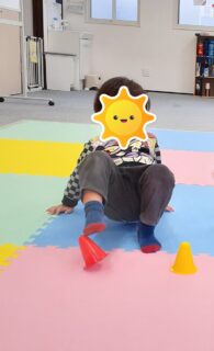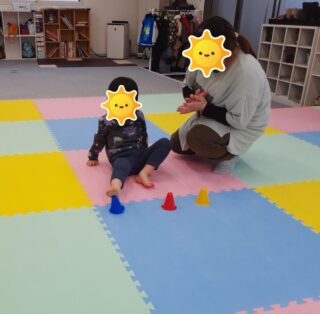 職員が伝えた色のカラーコーンを片足を上げて優しくタッチできました!🙌
